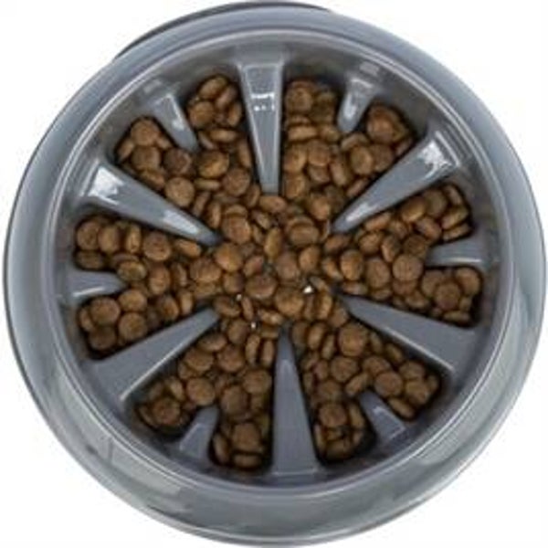 De Trixie Voerbak Slowfeeding Kunststof / TPR Assorti 20 cm is een voerbak voor de hond van kunststof die schrokken voorkomt, geschikt voor alle soorten voer. Het opschrokken van het voer kan nadelige gevolgen hebben voor de gezondheid van hond, zoals problemen met de maag en spijsvertering. Help deze problemen te verminderen met deze slowfeeder van Trixie. Deze anti-schrokbak zorgt dat de hond meer moeite moet doen om zijn voer te pakken te krijgen door de patronen in de bodem, wat zorgt voor langzamer eten. Deze voerbak is te gebruiken voor zowel natvoer als droogvoer en voorzien van een rubberen ring om schuiven te voorkomen. Vaatwasserbestendig!