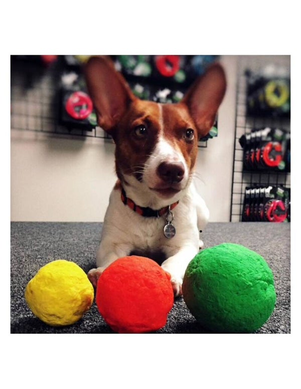 De rubberen bal is met de hand gemaakt en soms zijn er wat uitsteeksels. Als de hond lang met de bal bezig is dan kan hij met zijn voortanden kleine stukjes er van af trekken. Uiteindelijk blijft er dan niets van de bal over.
